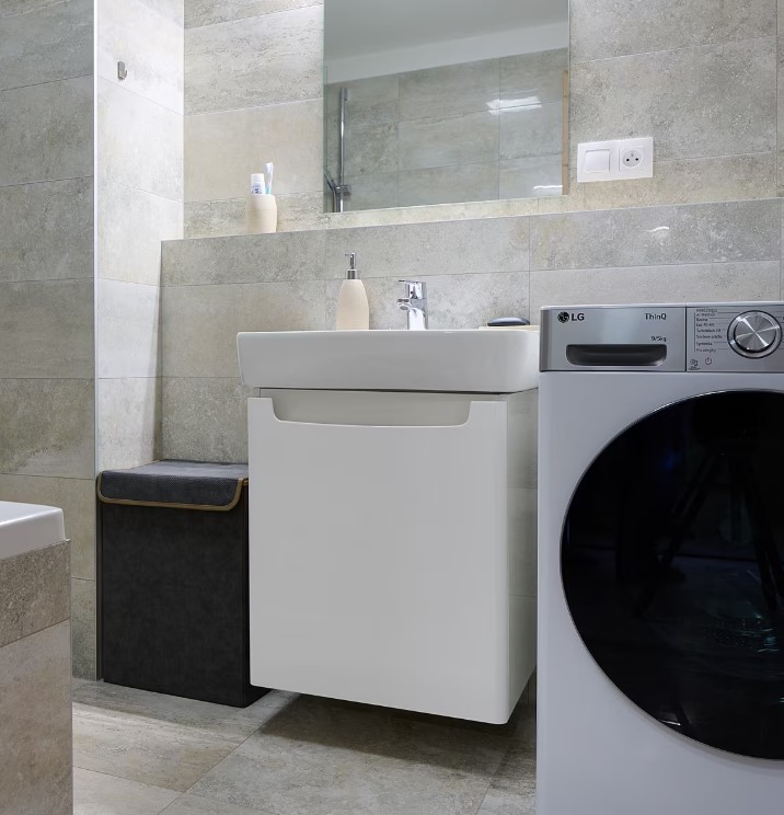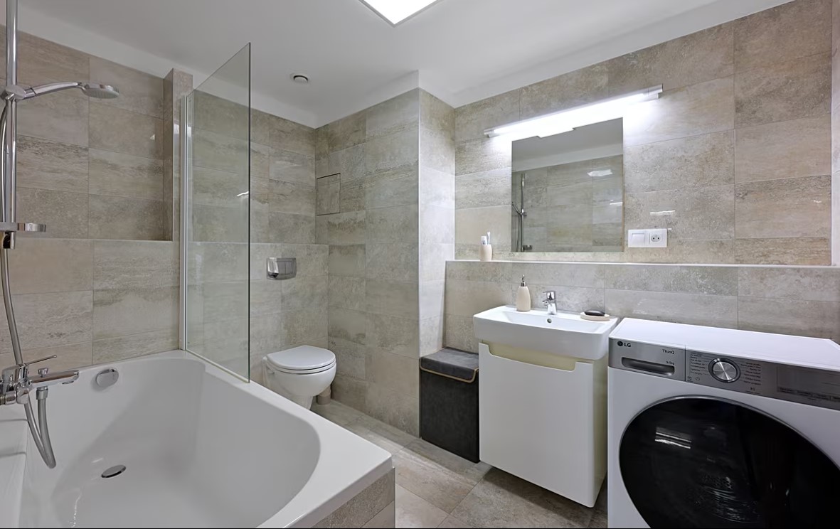 Prostorná koupelna s vanou je zařízena střídmě. Jediným kusem nábytku je lakovaná skříňka pod umyvadlem. Do koupelny se totiž nehodí levnější lamino, které snadno podléhá vlhkosti a časem se rozpadá — vyšší investice se zde jednoznačně vyplatí.