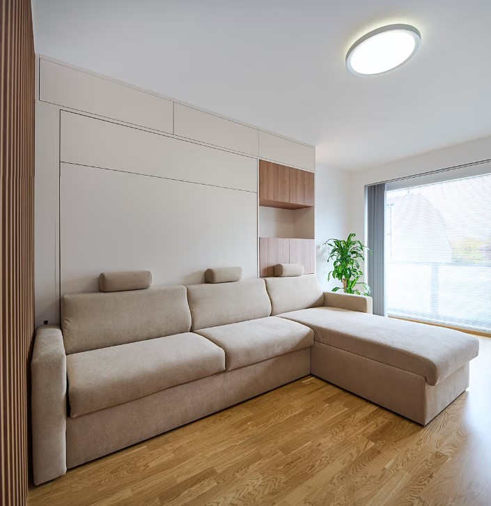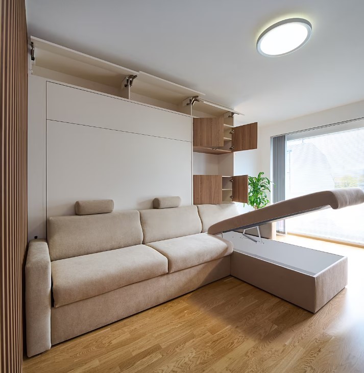 Přeměna denní zóny na ložnici je jednoduchá díky motorickému sklápění postele ovládanému dálkovým ovládáním.