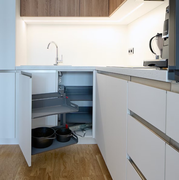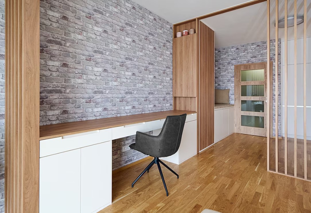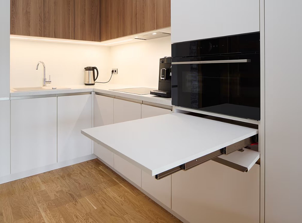 Pro studium i práci z domova slouží velký pracovní stůl, jehož boční části skrývají další úložné prostory. Kompaktní kuchyň je vybavena kompletní sadou spotřebičů, nechybí ani myčka. V případě potřeby lze snadno rozšířit pracovní plochu výsuvnou částí, která může posloužit i jako malé stolování. Když není potřeba, jednoduše se zasune. Kuchyňská linka sahá až ke stropu, aby se využil každý centimetr. Nízká komoda u kuchyně poskytuje místo pro odpočinek i příjemnou komunikaci při vaření. Pro co nejlepší využití rohu byl instalován výsuvný mechanismus.