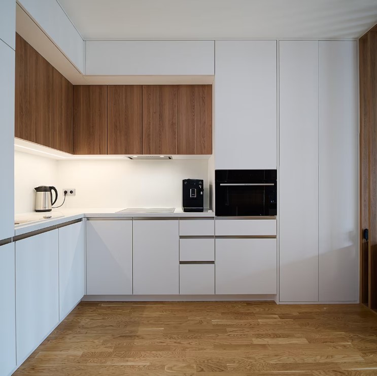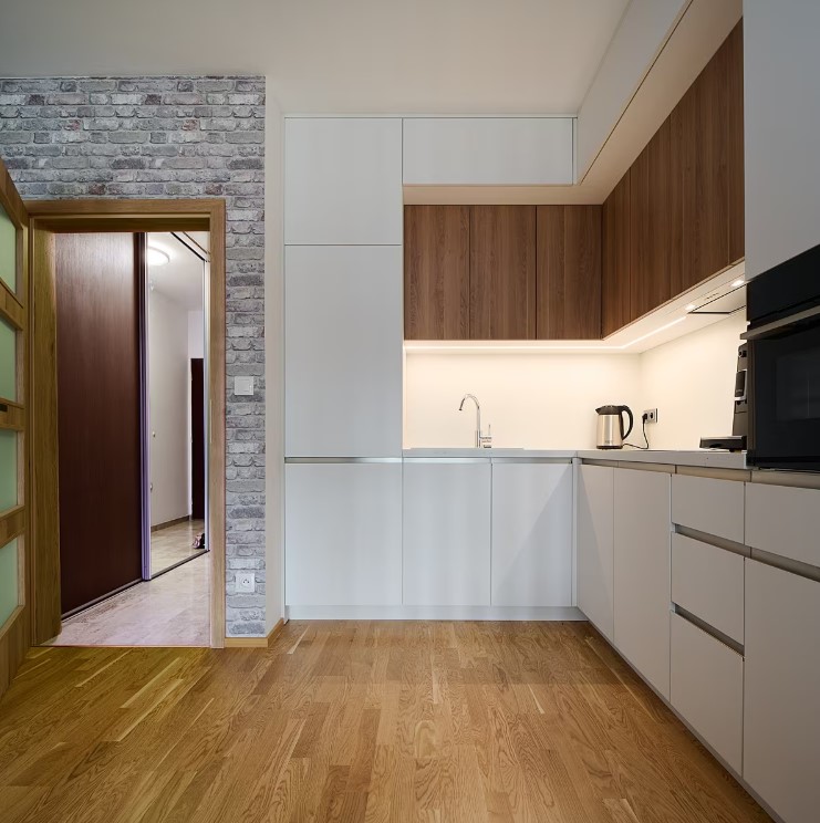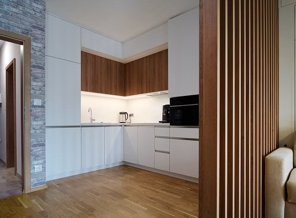 Designéři ze studia Woodface vytvořili návrh nábytku na míru, který je jednoduchý, nadčasový a díky světlým odstínům opticky zvětšuje celý prostor. Jemná lamelová příčka pak odděluje obývací část od kuchyňského koutu, aniž by prostor působil stísněně.