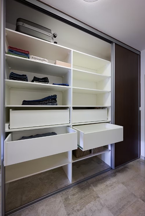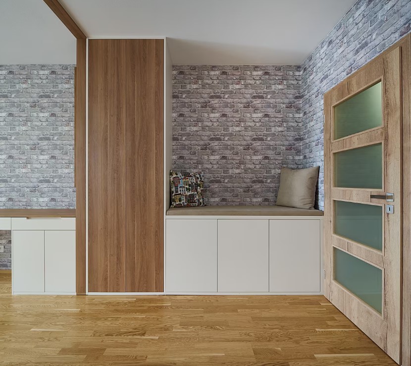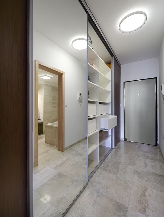 V předsíni byl kladen větší důraz na praktičnost než na dekor. Jednoduchá šatní skříň s posuvnými dveřmi poskytuje potřebné úložné kapacity.
