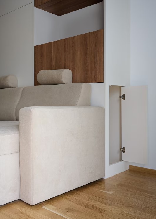 Dominantním prvkem malého bytu je prostorná rohová sedačka s lenoškou, pod kterou se ukrývá velký úložný prostor. Veškeré vybavení garsonky, včetně části rekonstrukce, bylo zaplaceno z prostředků ze stavebního spoření, které rodiče synovi dlouhodobě spořili. Schovaný prostor za lenoškou je přístupný z boční strany, aby bylo možné využít každé dostupné místo pro skladování.